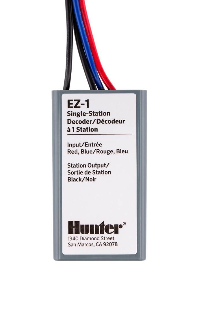 Decodificador EZ-1 Hunter para 1 setor, tecnologia de dois cabos, compatível com controladores Pro-C, HPC, ICC2 e HCC, instalação simplificada, IP68 submersível e LED de status para diagnóstico rápido.