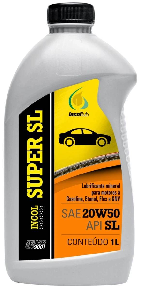 Óleo lubrificante mineral 20W50 INCOL Super SL para motores a gasolina, etanol, flex e GNV. Atende API SL, com registro ANP 7663, proteção contra desgaste e formação de depósitos.